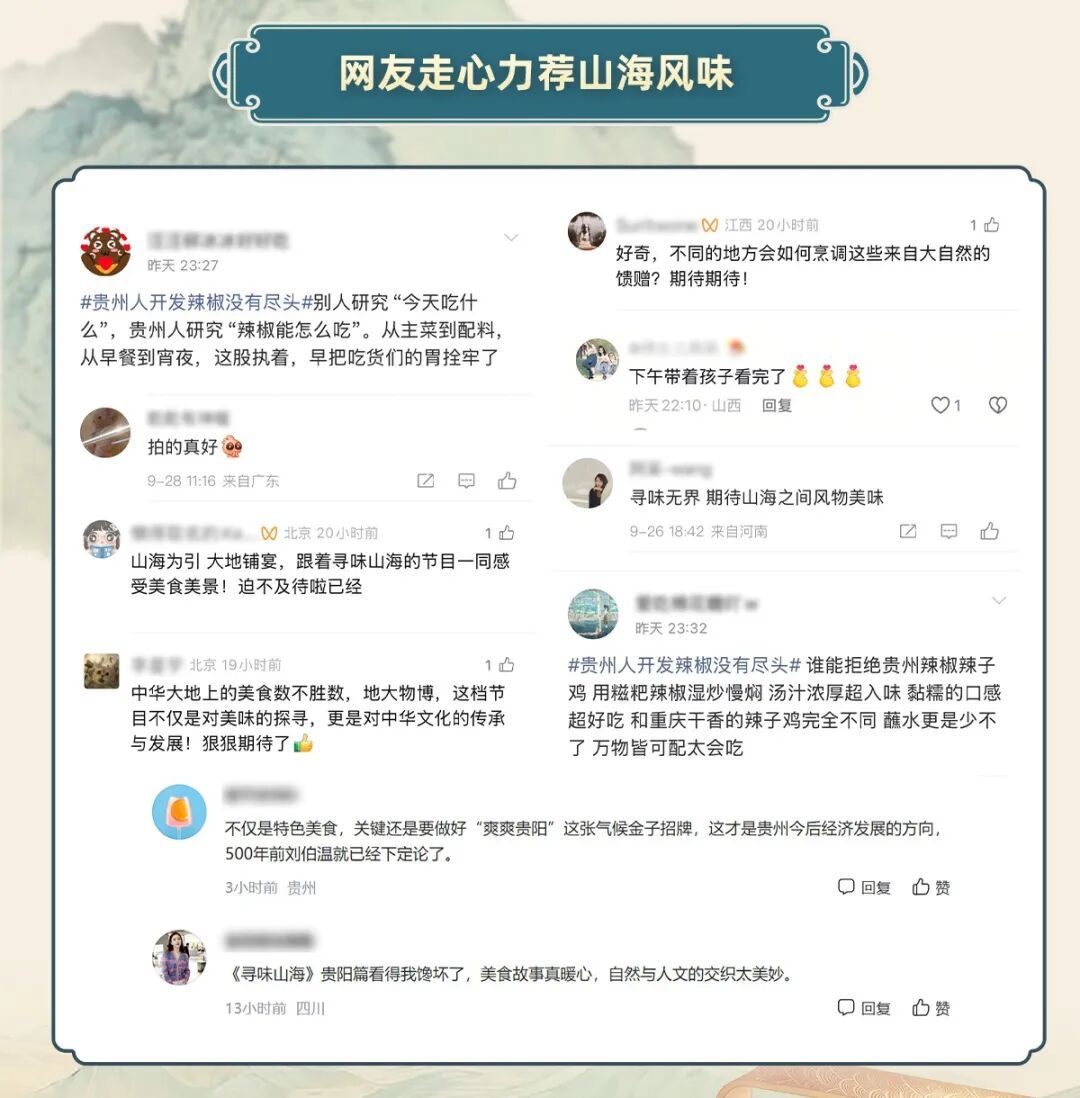 第一期贵阳篇播出后,瞬间“点燃”全国网友的味蕾。炽烈的辣子鸡、温润的豆腐圆子、清爽的刺梨饮无一不让人直呼“馋哭”。节目首播收视率0.80%,收视份额6.13%,在全国上星频道同时段排名第1,观众规模3688万人;全网视频播放量累计超3635万次,“贵州人开发辣椒没有尽头”相关微博话题总阅读量超5461万次,全网热搜热榜累计59次。光明网、中国网、澎湃新闻、南方日报、文汇报、中国青年报、贵阳日报等媒体纷纷关注,多角度报道呈现节目精彩看点。